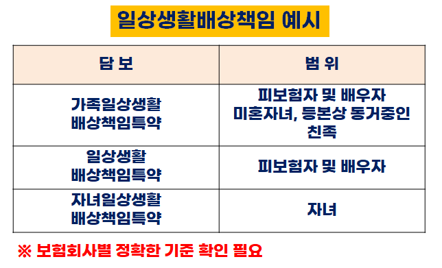 일상생활배상책임에서 중요한 것은 두가지 입니다. 첫째가 피보험자의 범위입니다. 피보험자의 범위는 회사별 운영하고 있는 기준, 또는 담보의 이름에 따라 조금씩 다릅니다. 예를들어 가입되어져 있는 담보 이름이 앞에 ‘가족’이라는 두글자가 붙은 가족일상생활배상책임 이라면 그 피보험자의 범위는 상당히 넓어집니다. 본인과 배우자 그리고 동거친족 (8촌내 혈족, 4촌 내 인척)과 유사한 범위를 지니기 때문에 내가 가입한 보험에 일상생활배상책임이 없다 하더라도 가족들의 증권에서 가족일생활배상책임이 있다면 내가 보상을 받을 수 있습니다. 이 때문에 피보험자의 범위를 확인하는 것이 중요하며, 가족 중에 한명은 기본적으로 있는지 체크해두시길 바랍니다.