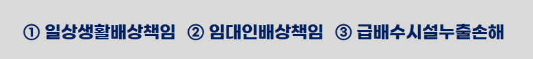 지인 입장에서는 특별한 과실이 있을만한 행동없이 자는 사이 일어난 엄청난 피해금액에 당연히 화가 날 수 밖에 없을 거라 이해는 합니다만, 피해가 발생함과 동시에 내 소유의 물건에서 발생한 문제인 만큼 책임을 피할 수 없고 아파트와의 분쟁 역시 수많은 누수 사고들의 결과로 보았을 때 책임을 넘기기는 어려울 것으로 보여집니다. 이럴 때 정신을 바짝 차리고 가장 먼저해야하는 것은 바로 내 보험증권을 살펴봐야합니다. 왜냐하면 보험 가입시 따로 설명을 듣지 못하였다 하더라도 보험으로 피해를 최소화 시킬 수 있는 방법들이 있기 때문입니다. 거주 형태나 가입된 보험에 따라 조금씩 상이하지만 확인해봐야만 하는 담보는 총 3가지 입니다. 담보 이름만 보면 조금씩 어렵고 생소한 단어들이지만 한번씩만 이해를 한다면 도움이 될 수 있는 정보인 만큼 하나씩 간략히 살펴보겠습니다.