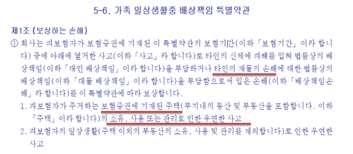 담보 이름 그대로 일상생활을 하는 중 누군가에게 배상을 할 일이 생길 때 보상을 받을 수 있는 담보입니다. 가장 먼저 찾아야하는 담보이기도 하고, 나도 모르게 많은 사람들이 가입되어져 있는 담보이기 때문입니다. 개인보험을 종합적으로 가입한 분이라면 아마 대부분 해당 담보가 가입되어져 있는 걸 보실 수 있으실텐데, 저렴한 보험료에도 잘 몰라서 혜택을 못받을 뿐이지 엄청난 역할을 할 수도 있는 담보입니다. 대부분의 약관 정의에는 우연한 사고로 대인배상 또는 대물배상책임을 부담함으로써 입은 손해를 보상합니다. 라고 명기되어 있습니다. 물론 고의라던지 천재지변 등은 면책 (회사별 상이)이지만 여기서 다루고자하는 누수 손해는 면책에 해당되지 않기 때문에 내가 피해를 입힌 부분은 대물배상으로 자기부담금 일부를 제외하고 보상이 가능합니다.