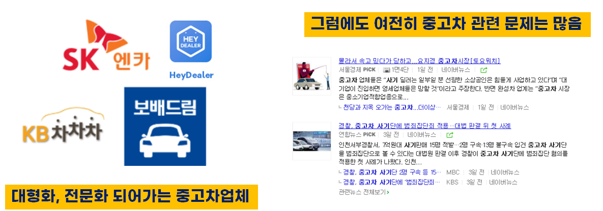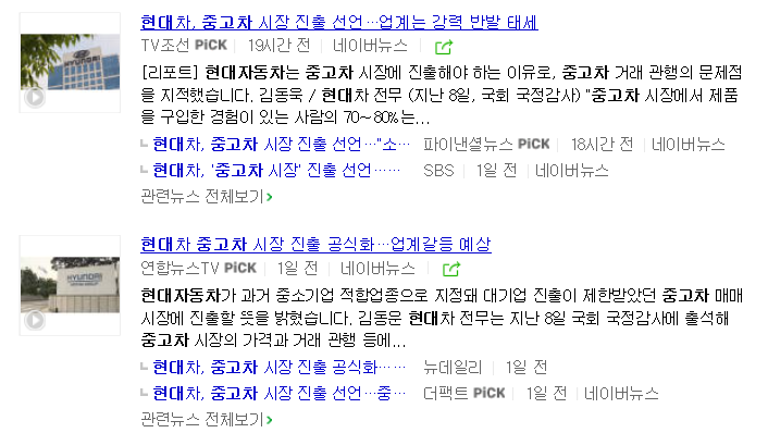 통상 대기업의 골목상권 진출에 여론은 부정적인 태도를 보이는 것이 많았음에도 불구하고 여전히 중고차 매매에 스트레스를 받는 소비자들도 있고, 현대자동차와 같은 대기업의 공식적인 가격정찰제와 신뢰를 원하고 있기 때문에 이번 이슈에 찬성 의견을 던지고 있는 중입니다. 실제 경기도가 지난 2개월간 간 허위매물을 올려놓은 것으로 의심되는 중고차 온라인 매매 사이트 31곳의 판매상품을 조사한 결과 95%가 ‘가짜’ 매물인 것으로 나타났고 해당 차량 가격은 터무니없이 낮게 표기해 소비자를 유인해온 것으로 밝혀졌습니다. 이 때문에 현대자동차 역시 중고차 시장진출의 명분을 소비자 권익 보호 및 소비자 만족으로 내세우고 있습니다.