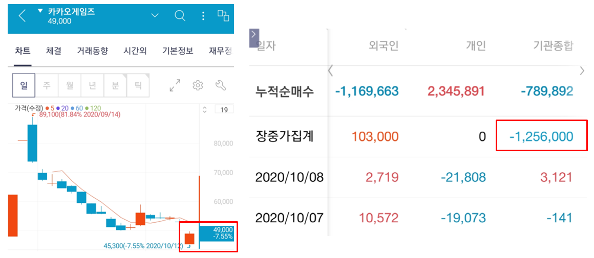 아직 장중에지만 현재 카카오게임즈의 기관물량이 추정치 -125만주 진행되고 있고 이에 따라 당일 -7.55% 의 흐름을 가져가고 있으며 이러한 흐름이 장 마지막에 회복되기는 어려울 것으로 추정됩니다. 사실 동일한 패턴으로 SK바이오팜 역시 의무보호예수가 해제 되던 날 주가 급락이 이루어져 공모주를 시작한지 얼마 안된 분들이 사전학습되어 있는 경우가 많아 지난주까지의 하락세도 이것이 어느정도 반영된 것으로 보여집니다. 증권업계에서는 3~4만 수준이 적정 주가라고 발표를 하고 있지만 단순히 향후 보호 예수기간이 풀린 물량들 소진 추이와 이를 만회하기 위하여 현재 진행 중인 '달빛조각사 1주년 이벤트' , '가디언테일즈' 등의 해외매출 실적에 따른 매수세의 힘겨루기에 따라 방향이 정해질 것으로 보여집니다.