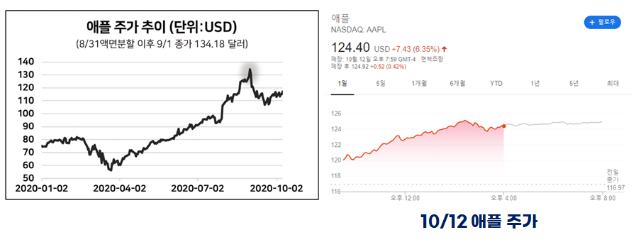 하반기 모바일 업계에서의 가장 큰 이슈는 바로 애플의 아이폰12 출시이지 않을까 싶습니다. 코로나19 펜데믹으로 인하여 4월 직전까지 크게 하락세를 보였던 애플이 9월까지 지속 상승 추세에 있다가 최근들어 다시 하락 및 조정하는 모습을 보이고 있습니다. 그렇기 때문에 애플의 신제품 아이폰12가 하락세에 있는 애플의 주가를 반등 시킬 수 있을지에 대한 관심이 쏠리고 있습니다. 현재 10월 13일 첫 공개 (한국시간 기준으로 10월 14일 수요일) 되며 기대감을 계속해서 끌어올리고 있는 가운데 10월 12일 애플의 주가는 6.35% 상승 마감하며 그 기대감의 크기를 짐작할 수 있었습니다.