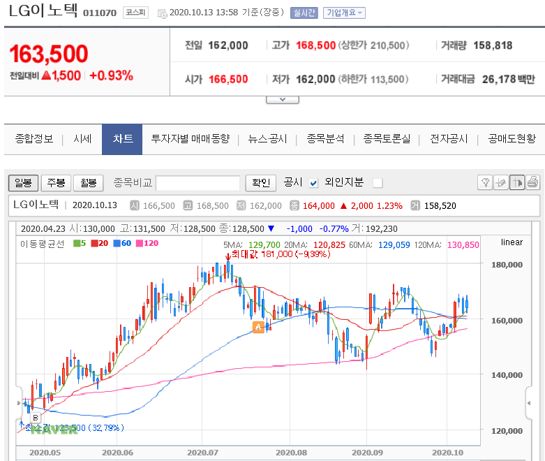 LG라는 이름 때문에 LG핸드폰 관련이 아닌가 오해할 수 있지만 전기전자부품 제조 및 판매를 주요사업으로 하고 있는 종합 전자부품업체로써 광학솔루션, 기판소재, 전장부품 등 3가지 사업부로 운영되고 있습니다. 그중 광학솔루션 사업부에서 아이폰에 들어가는 카메라 모듈을 공급하고 있기에 아이폰12 관련주로 분류되어 있습니다. 현재 시가총액이 3억 중반을 넘어가는 대형주로써, 아이폰12의 바람에 힘입어 4분기 최대 매출도 예상되는 분석도 있는 등 장기적인 관점에서도 관심 가져볼만한 기업입니다.