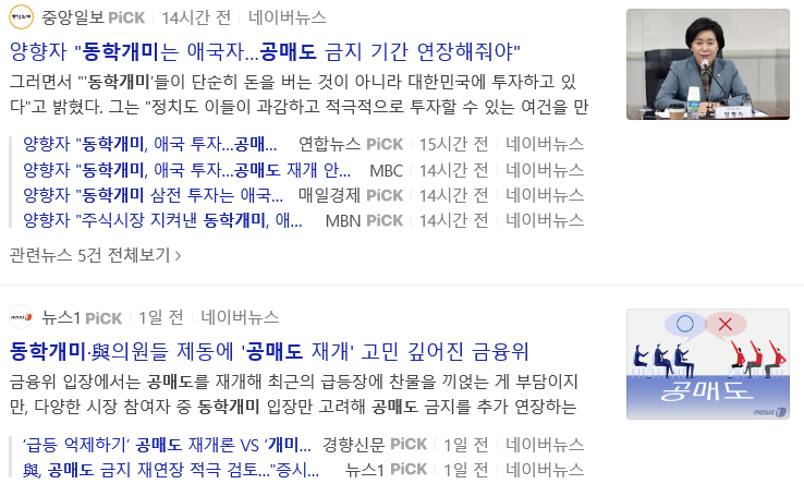 ① 다양한 뉴스나 의견들을 보면 여러 가지 논리들이 공방을 벌이고 있지만 이번의 공매도 논란의 핵심은 공매도의 주체에서 비롯되었다고 보입니다. 국내 증시에서 이루어지는 공매도의 주체는 대부분이 외국인, 그리고 기관투자자이기 때문입니다. 현재 빚투 열풍, 동학 개미 운동 등으로 개인투자자들의 엄청난 자금이 투입되어 있는 현재 상황에서 공매도 재개가 증시 하락을 부추겨 개인투자자들의 큰 금전적 손실 가져다줄 수 있으며 주식시장의 유동성을 오히려 죽일 수도 있는, 불공정한 경제적 기능인 공매도 재개 반대의견은 개인투자자가 대다수를 차지합니다.