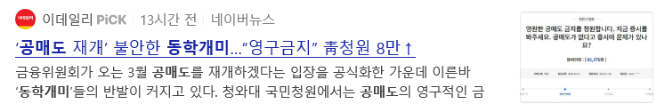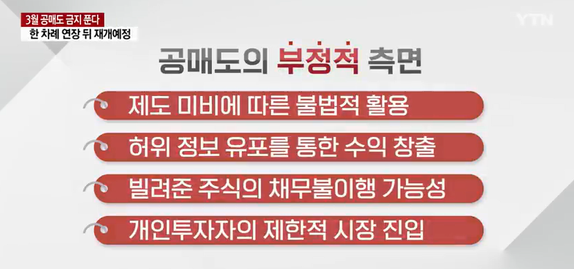 ② 반대로 불법 공매도에 대한 처벌을 강화하며 시행할 예정이며, 과거에도 계속해서 존재해왔던 공매도가 당장 큰 영향을 주지 않으며, 오히려 거품으로 올라간 주가가 나중에 더욱 큰 손실로 다가올 수 있는 리스크를 막기 위함이라는 금융위원회의 입장은 지속 대립 중입니다.