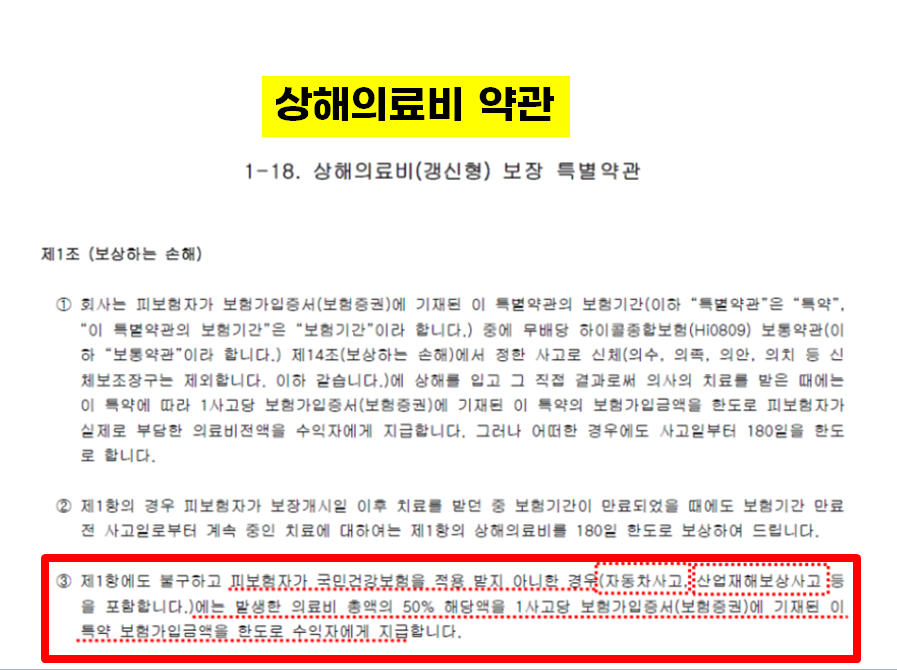 이렇게 자동차보험에서 치료비를 보상받을 경우 대부분의 실손의료비에서는 추가로 보장을 받지 못하게 됩니다. 과거 상해의료비 가입자 같은 경우는 보상이 가능하지만, 이중 보상의 문제로 인하여 자동차보험 또는 산재보험에서 치료비를 보상 받았을 경우 실손보험의 약관상 보장하지 않는 손해로 명기가 되어있습니다.