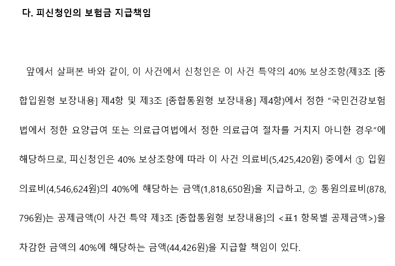쉽게 요약하자면 과실 비율로 인하여 받지 못한 치료비 부분은 신청인이 요구한 90%는 아니지만 약관상에서 명기하고 있는 기준 처럼 실제 부담한 금액의 40%는 지급해야 함이 최종 결론으로 나오게 되었습니다. 분쟁 조정의 근거가 된 내용은 국민건강보험법 또는 의료급여법을 적용받지 못하는 경우에 입원의료비 중 본인이 실제로 부담한 금액의 40% 해당액을 보험가입금액 한도 내에서 보상하라는 항목이 적용된 것으로 명확한 분쟁 조정 판례가 나오게 되었습니다.