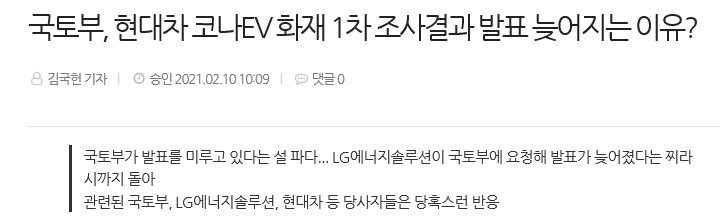 문제는 국토교통부의 결과 발표가 지속적으로 연기되고 있다는 점입니다. 당초 20년 말에는 1차 발표가 있을 것이라는 예상되었으나 언급되지 않았고 1월 말 경의 발표를 또다시 예상했으나 조용한 상황입니다. 이 때문에 일부 언론에서는 1차 조사 결과가 나왔으나 LG 측의 요청으로 인하여 발표를 미루고 있는 것이다 라는 검증되지 않은 소식까지 들려오고 있습니다. 국토부 관계자는 조사 결과 도출이 지연되는 것은 맞으나 지연 사유에 대해서는 밝힐 수 없다는 더욱 의혹을 증폭시키고 있는데 어떠한 발표를 하던 해당 산업에 큰 영향을 가져올 수 있는 사실이기에 신중하게 움직이려는 모습으로 해석되어집니다. 2021년 2월 10일 일부 언론사에서 해당 화재 문제의 사고 원인이 배터리 결함 쪽으로 결정되고 있다는 발표가 오전에 있었으나 LG쪽의 반발이 있었고, 이후 기사들이 수정되거나 사라지는 등 씨끌벅적였으나 확실한 것은 최종적인 공식 발표를 기다리는 수 밖엔 없을 것으로 보여집니다.