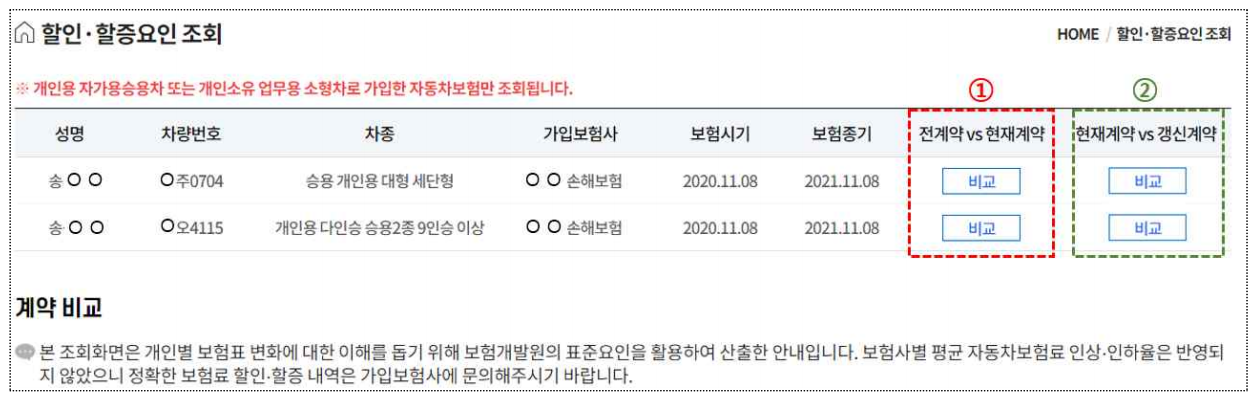 또한 전계약vs 현재계약 분류에 비교 버튼 (①) 을 클릭할 경우 보험료 할인, 할증내역을 비교하여 볼 수 있습니다. 그 오른쪽에 있는 현재계약 vs 갱신계약 분류 (②) 는 만기가 1달 이내로 남았을 경우 현재계약과 앞으로 갱신될 계약의 예상되는 보험료 할인, 할증 내역을 조회하는 것이 가능해졌습니다.