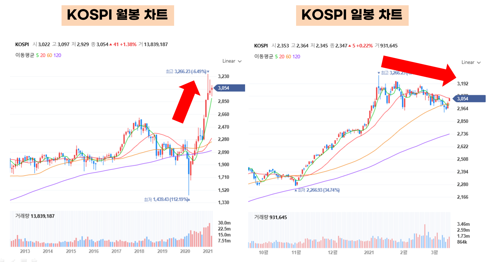 작년 주식에 입문하여 부수적인 수입을 올리며 주식을 진작 해볼 걸 너무 늦게 시작한것 같다고 말하던 주위 사람들의 탄식이 최근 이어져 오고 있다. 2020년 코로나19로 인한 폭락 이후 하락이 무색할 만큼 가파른 상승을 이어온 코스피 시장은 아래 왼쪽의 월봉 차트를 통해 공감할 수 있을 것이다. 계속 되는 상승에 어느정도 테마와 우량종목들만 보유하고 있었어도 수익이 보장될 수 있었던 시장 환경이 지속되었지만 그 환경이 변화하기 시작하였다.