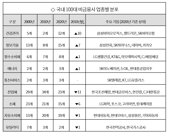 이러한 시가총액을 순위를 통해 알 수 있는 것은, 시가총액 순위 변화를 통해 현재 시장에서 주목받고 있는 트렌드를 파악할 수 있다는 것입니다. 아래 표를 통해 해석하자면 2000년 100대 비금융사 업종별 분포에서 가장 많은 점유율을 차지하고 있는 것은 산업재 업종으로 29개를 차지하고 있고, 2010년이되며 34개 기업이 100대에 포함되며 성장성을 확인할 수 있습니다. 하지만 2020년에 들어서며 11개 기업이 줄어든 23개 기업이 포진되며 꺽인 모습을 볼 수 있으며 반대로 건강관리 관련 기업들의 숫자가 많이 늘어난 것을 확인 할 수 있습니다. 이 처럼 트렌드를 분석하는데 있어서 시가총액이 활용될 수 있으며, 해당 기업의 향후 업황을 예측하는데 도움이 됩니다.