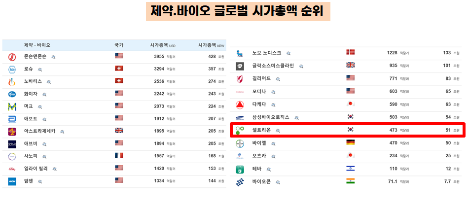 이러한 시가총액은 특히나 관심있는 기업을 분석하는데 필수적인 요소로 작용합니다. 어느 기업이 저평가되어 있고, 고평가되어 있는지를 판단하는 방법은 여러가지가 있지만 상당한 부분으로 영향을 미치는 것이 바로 시가총액이기 때문입니다. 예를 들어 '셀트리온' 기업에 관심이 많은데 현재 주가가 이미 많이 올라 높은 상태에서 현재 가격이 적정 수준인지 저평가인지 궁금하다고 가정해보겠습니다. 이럴땐 동일 업종에서 비슷한 연구와 개발, 판매를 하고 있는 기업과 시가총액을 비교해볼 수도 있습니다. 위 예시처럼 '셀트리온'은 바이오제약 관련 업종으로 국내에서 비교가 어려운 만큼 글로벌 시가총액 비교를 통해 향후 갈 수 있는 시가총액 규모를 확인해서 판단해볼 수도 있습니다. (글로벌 시가총액 비교 : 미스터캡 검색)