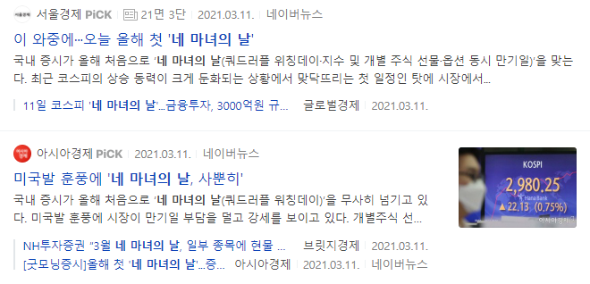 위 4가지 파생상품 만기일이 겹치는 날을 의미하며 이러한 날은 1년에 4번 발생하게 됩니다. 3월 / 6월 / 9월 / 12월 둘쨋주 목요일은 항상 4가지 파생상품이 만기가 겹치기에 '네 마녀의 날', 영어로는 '쿼드러플 위칭데이'라고 표현하고 있습니다.