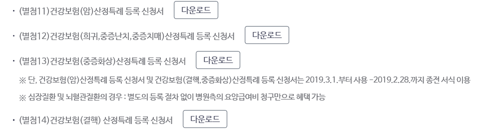 중증질환자에 해당하는 상병은 외래 또는 입원 진료시 요양급여비용 총액의 100분의 5본인 일부부담이 발생하게 됩니다. 다시 말해서 95%의 지원을 받을 수 있고 5%만 본인부담금 수준만 납부하면 됩니다. 주요 상병으로는 뇌혈관질환, 심장질환, 중증화상, 암 등이 이에 해당이 되며 상병별로 지원 대상이 되는 기준이 상이하며 지원 받는 기간도 다르므로 구체적 상병의 지원 수준을 확인하기 위해서는 홈페이지에서 받을 수 있는 별첨 파일을 확인할 필요가 있습니다.