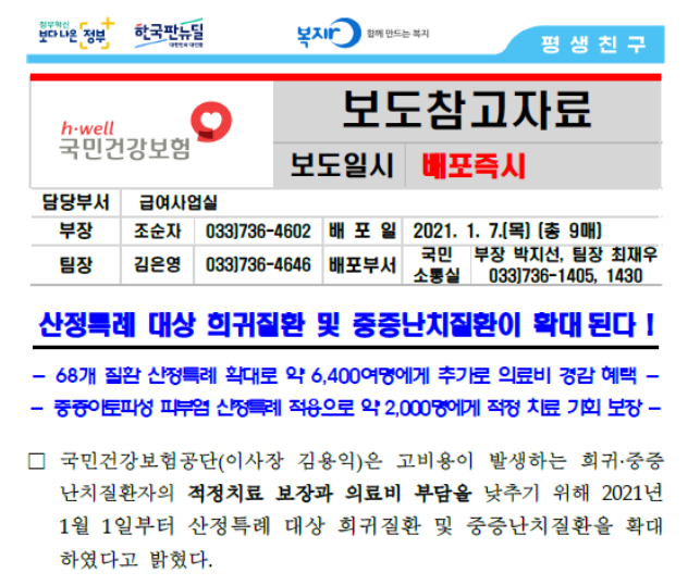 이러한 산정특례 제도는 암과 같은 질병이 재발이 확인되거나 희귀 난치성 질환의 경우에도 재등록하여 수혜를 볼 수 있는 케이스들을 더욱 커버하려 하고 있으며 2021년 1월 7일에 발표한 내용 처럼 중증난치질환 68개 질병을 확대하는 등의 노력을 하고 있는 만큼 약점들을 보완해나가고 있는 중입니다.