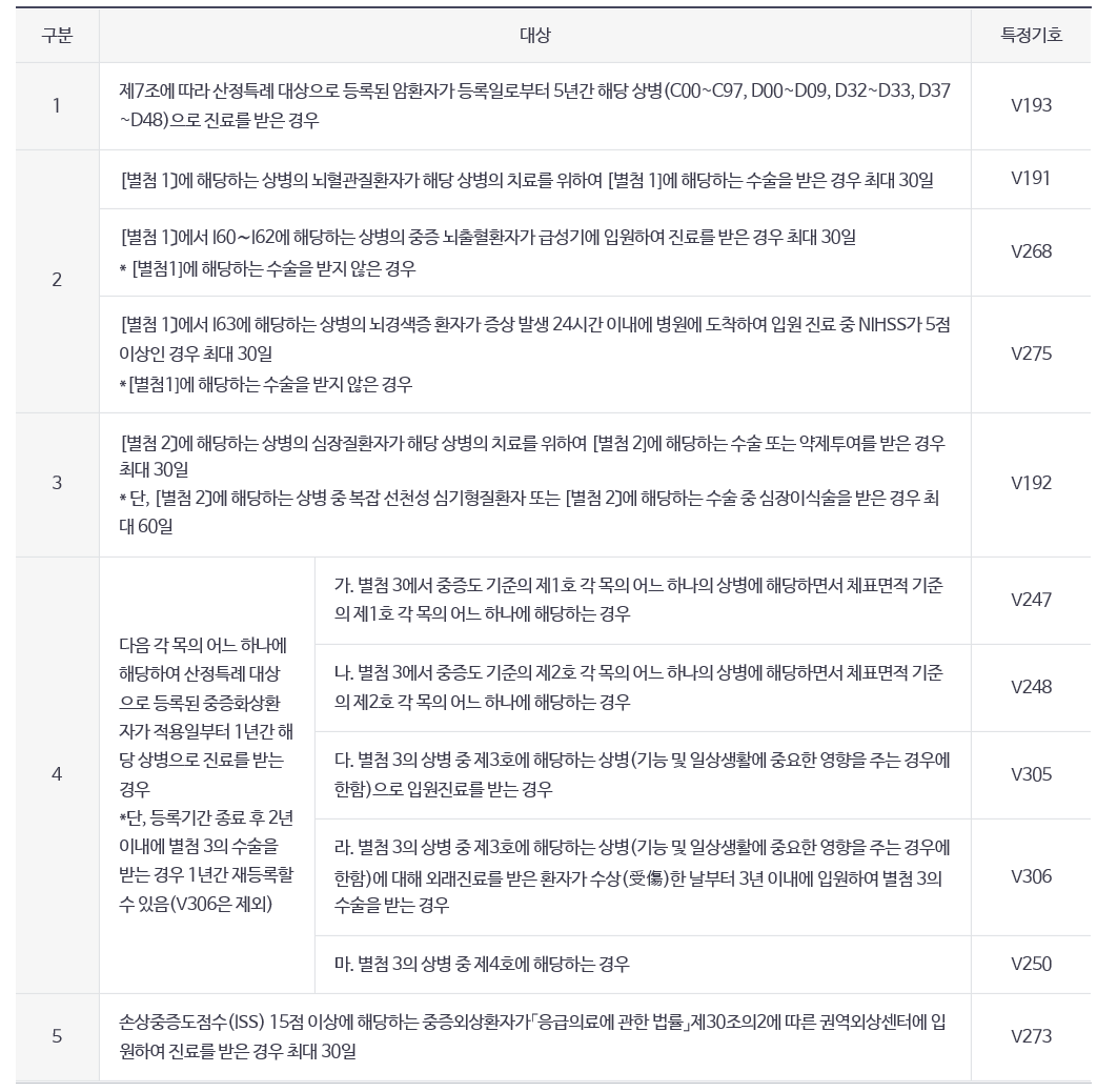1. 중증질환자 산정특례 대상 (암, 뇌, 심, 화상 등)