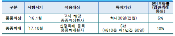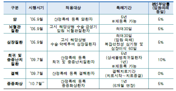 중증질환자에 해당하는 상병은 외래 또는 입원 진료시 요양급여비용 총액의 100분의 5본인 일부부담이 발생하게 됩니다. 다시 말해서 95%의 지원을 받을 수 있고 5%만 본인부담금 수준만 납부하면 됩니다. 주요 상병으로는 뇌혈관질환, 심장질환, 중증화상, 암 등이 이에 해당이 되며 상병별로 지원 대상이 되는 기준이 상이하며 지원 받는 기간도 다르므로 구체적 상병의 지원 수준을 확인하기 위해서는 홈페이지에서 받을 수 있는 별첨 파일을 확인할 필요가 있습니다.