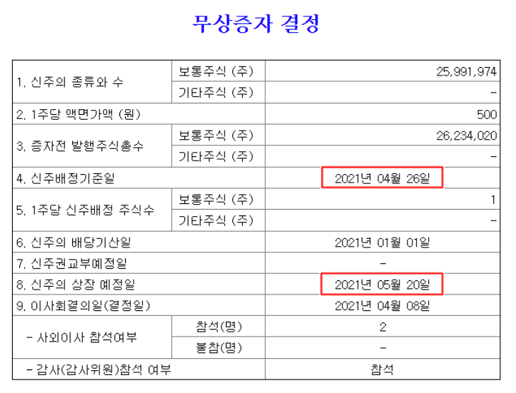 3. 신주 상장 예정일 : 2021년 5월 20일 → 22일까지 주식을 보유한 주주의 계좌에 신주가 들어와 거래가 가능해지는 날짜