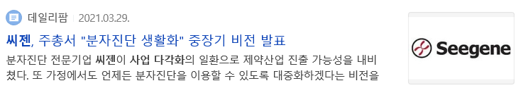씨젠의 가장 큰 약점으로 언제나 언급되었던 부분은 바로 코로나19 진단 이후의 실적은 큰 폭으로 감소할 수 밖에 없다라는 사실이었습니다. 흔히 표현하는 '포스트 코로나' 에 대한 우려는 틀린 말은 아니지만 바이오 기업의 특성상 새로운 시장 진출이든, 새로운 파이프라인 구축이든 결국엔 돈과의 싸움으로 직결될 수 밖엔 없습니다. 씨젠은 현재 발생되고 있는 엄청난 이익을 통해서 어느 새로운 분야로 진출하거나 분자진단분야의 다각화를 할 수 있는 자산을 보유하고 있습니다. 또한 코로나 진단키트 수출을 경험하며 쌓아온 글로벌 유통망 체인과 기업, 국가들의 관계는 그 어느 기업도 시도해보지 못한 경험치를 얻게되었습니다. 씨젠은 지난해말 정기 주주총회에서 사업비전을 발표하며 중장기적인 전략으로 M&A를 언급하며 M&A 담당임원을 영입하였습니다. 공식적으로 확정된 것이 없다고 밝혔지만 제약사 M&A 추진설도 이 때문에 나온 소문이며 터무니 없는 방향은 아니라고 보여집니다.