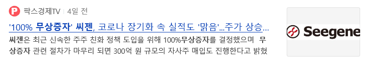 앞선 포스팅에서 언급한 것 처럼 무상증자 발표일에는 대부분의 기업들의 주가는 상승을 하게됩니다. 씨젠 역시 4월 8일 무상증자 발표일 당일 19.37% 의 급등을 하며 시장의 관심을 불러 일으켰습니다. 기업별 무상증자 발표일 이후의 흐름은 지속상승을 이어가기도 하지만 다시 하락하여 권리락일을 맞이하곤 합니다만, 씨젠의 경우 현재까지 (20일) 지속적인 상승 흐름을 이어오고 있습니다. 그만큼 시장의 관심을 많이 받고있다는 증거이며 기준일 D-2일인 4월 22일에도 신주를 받기 위한 매수세도 기대해볼 수 있는 부분입니다.