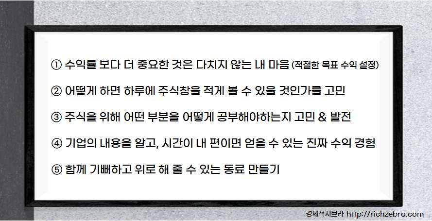 직장인이라면 어쩌면 당연하면서도 기본적인 이야기라 할 순 있다. 어차피 정답은 없는 주식 매매방법, 하지만 어느 소속도 아닌 일반적인 한 직장인 개미투자자인 필자가 지키고자 노력 중인 직장인의 투자방법을 참고하여 고민 해 본다면 적어도 결과가 더 긍정적이고 건강하지 않을까 한다. 포스팅을 이어나가며 중간 중간 추가되는 내용들이 있겠지만, 다루고자 하는 주요 이야기는 크게 아래 5가지와 같다.