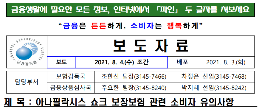 여러 보험사에서 코로나19 이후 순차적으로 출시한 것은 상품이 아닌 "아낙필라시스 쇼크" 관련된 담보입니다. 여러 보험사에서 출시를 하며 백신보험이라는 호칭으로 판매가 이루어지다 보니 금융감독원에서 보도자료를 통해 해당 담보의 과장광고 및 불완전판매를 예방하기 시작하였습니다.