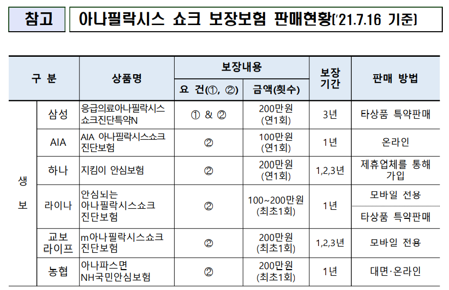 - 보험회사마다 상품구조, 보장요건 및 보장금이 다르므로 가입시점에 보험 상품의 주요내용을 꼼꼼히 확인하는 것이 필요합니다. 기존 상품의 특약 형태로 가입을 한다면 이번 백신 이슈 뿐만 아니라 미래 발생할 수 있는 다양한 형태의 아나필락시스쇼크 보장을 받을 수 있기에 선택을 고려해볼 수 있습니다. 만약 아나필락시스쇼크 관련 보장을 받고 싶다 하시는 분들은 보험금을 지급 받을 수 있는 요건인 응급실내원과 진단 두가지 조건이 함께 있는 것 보다는 진단만으로 보장 받을 수 있는 것이 유리하고 가입금액은 당연히 큰 것이, 횟수는 최초1회 보다는 연1회 보장으로 선택하는 것을 추천드립니다.