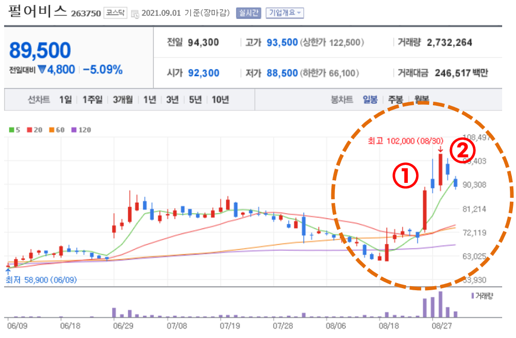 그러던 8월 중순 위 차트상 ① 시점을 맞이하며 펄어비스는 엄청난 반등 추세를 만들어갑니다.