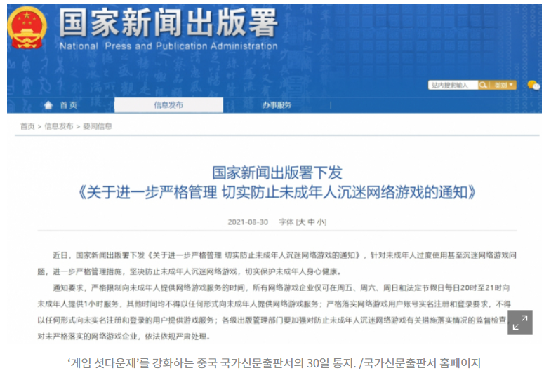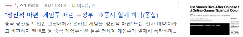 2021년 하반기, 특히 8월에 접어들며 국내 게임시장 관련 주가는 하락세를 면치 못하고 있었습니다. 그 이유는 바로 중국정부의 조치. '게임은 정신적 아편' 이라고 까지 표현하며 중국의 관영매체에서 온라인 게임들에 대한 부정적인 비판의견들이 나오고 규제 소식까지 들리며 중국 게임시장 뿐만 아니라 국내 게임시장에도 큰 영향을 미쳤습니다.