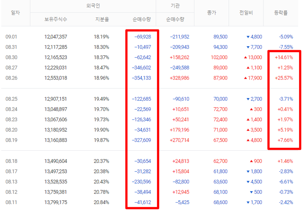 하지만 서두에서 언급한 것 처럼 작은 악재도 주가에는 확대되어 반영됨은 피할 수 없습니다. 게다가 중국 규제에 대한 보수적인 외국인 매도세가 지금 처럼 지속되며, 어느 정도의 공매도 세력과 그동안 상승분에 대한 조정이라는 여러 악재들이 뒤섞여 당분간 주가의 흐름은 하락세가 지속될 가능성이 높습니다.