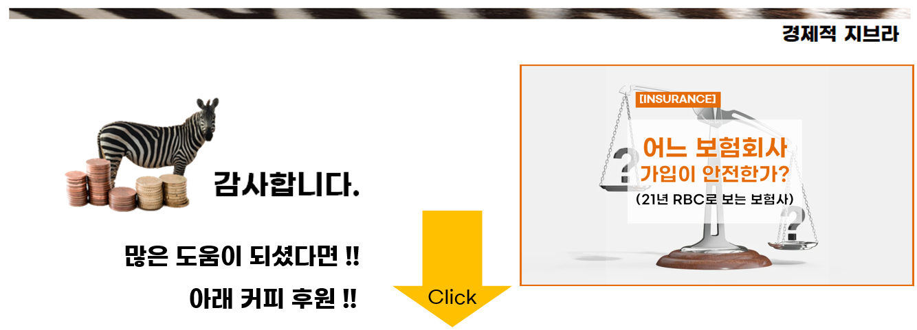 서두에 말씀드렸던 것 처럼 좋은 보험사인지 여부를 판단하는 여러기준이 있겠지만 RBC기준을 통한 보험사의 재무건전성을 확인았습니다. 개인적으로는 당장의 큰 차이 안나는 작은 보험료의 차이라면 안전한 보험사를 선택하는 것이 미래에도 안전하고 바람직한 보험 가입의 방법이라고 판단되며, 추후 변화되어 보도되어지는 RBC 비율 데이터 및 기준도 지속 공유드리겠습니다.