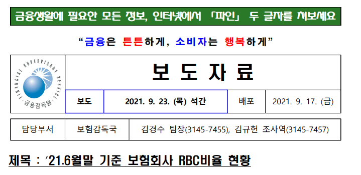자 그럼, 보험회사 (생보, 손보) 별로 RBC 비율이 어떤지를 알아야 상대적으로 어느 보험사가 안전하구나 라는 것을 비교해볼 수 있을 텐데 금일 금융감독원 보도자료를 통해서 `21년 6월말 기준 보험회사 RBC 비율이 공개되었습니다.
