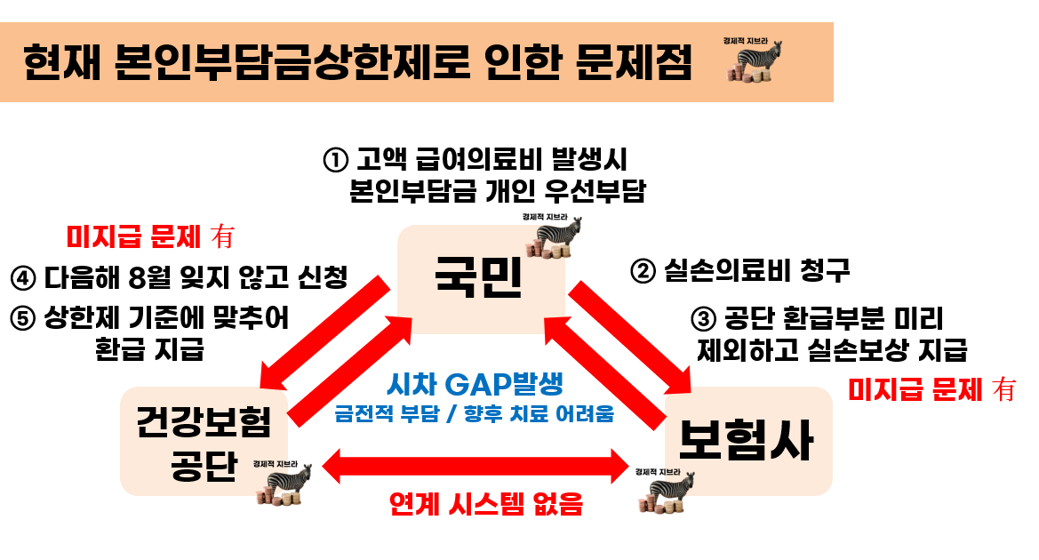 첫째, 건강보험공단의 제도로 운영되는 본인부담금상한액은 본인이 부담한 병원비 중 소득분위별 상한액을 정해 비급여를 제외하고 초과된 금액에 대해 건강보험공단이 되돌려주는 국민의료지원제도입니다. 문제는 연단위를 기준으로 하다보니 올해 발생된 의료비용은 그 다음해에 되돌려 받을 수 있으며, 또 다른 문제는 공단으로 환급대상자가 직접 신청해서 받는 것이 일반적이라는 것입니다.