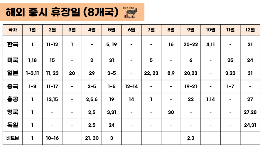 더불어 해외주식을 해본 경험이 있는 분들은 경험하셨을만 한 휴장일입니다. 분명 평일이고 시간대를 맞추었는데 주가의 변동이 없어 증권사 MTS, HTS의 오류인가 생각했지만 알고보니 해당 국가의 휴장일인 경우가 있습니다. 이 또한 국가별 휴장일 공유를 해드리오니 참고하시기 바랍니다. (해당 휴장일은 2021년 기준으로 작성되었으며 국가별 상황에 따라서 추가적인 휴장일이 있을 수 있으며, 연도가 바뀔 경우 일정치 않은 날들이 있습니다.)