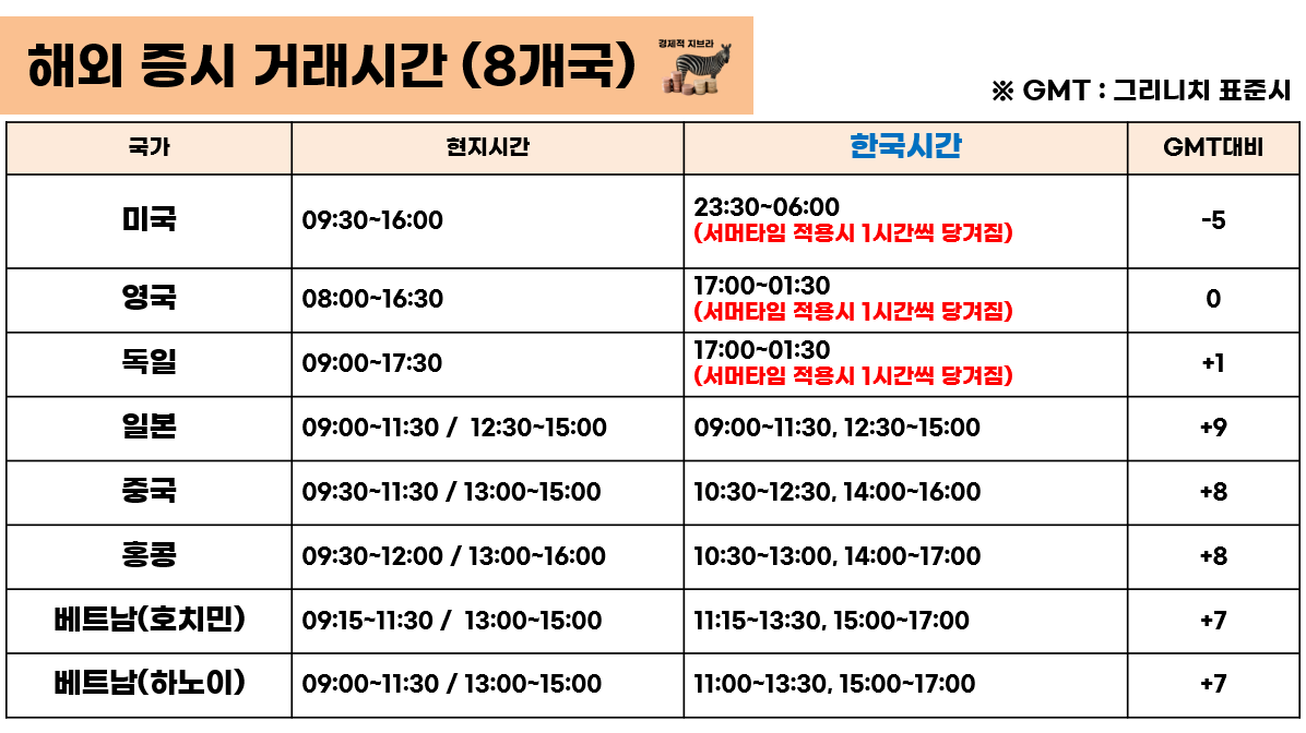 아래 주식시간의 규모가 가장 큰 미국주식거래 시간을 포함하여 아시아 주요증시 (중국주식거래시간, 일본주식거래시간, 홍콩주식거래시간) 등 8개국의 주식 거래시간을 공유드리오니 계획수립에 참고하시기 바랍니다.