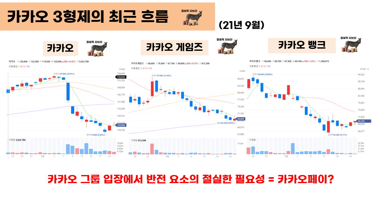 현재 카카오페이를 놓고 최근 플랫폼 규제로 인한 하락세에 허덕이고 있는 카카오의 반전의 방아쇠가 될 수 있을 것인가에 초점이 맞추어져 있는 만큼 이번 카카오페이의 상장은 매우 중요한 의미를 지니고 있습니다. 현존하는 카카오 3형제 (카카오, 카카오게임즈, 카카오뱅크) 모두 좋지 않은 흐름을 가져가는 가운데 그 하락의 고리를 끊을 수 있는 핵심키를 카카오페이가 가지고 있기 때문입니다.