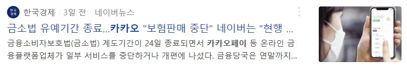 이번 금소법에서의 핵심 논점은 카카오페이 등 핀테크업체의 금융상품 소개 서비스(보험, 증권)를 '광고'가 아닌 '중개'로 봐야하고, 금융상품 중개를 할 경우 금융위원회에 등록하거나 인허가를 받아야 한다는 것 때문입니다. 그 동안 카카오페이는 자동차보험 (비교서비스), 운전자보험, 반려견보험 등 의 서비스를 제공하였고 현실적으로 대형플랫폼에서의 해당 서비스는 여러 보험사들에게 영향을 크게 줄 수 있는 존재였습니다. 실제로 카카오페이의 금융서비스(펀드·대출·보험) 매출 비중은 2019년 2.4%에서 2020년 22.7%로 급등하였으며 올해 상반기 매출액 중 32%인 695억원이 금융상품 관련 매출로 밝혀졌습니다.