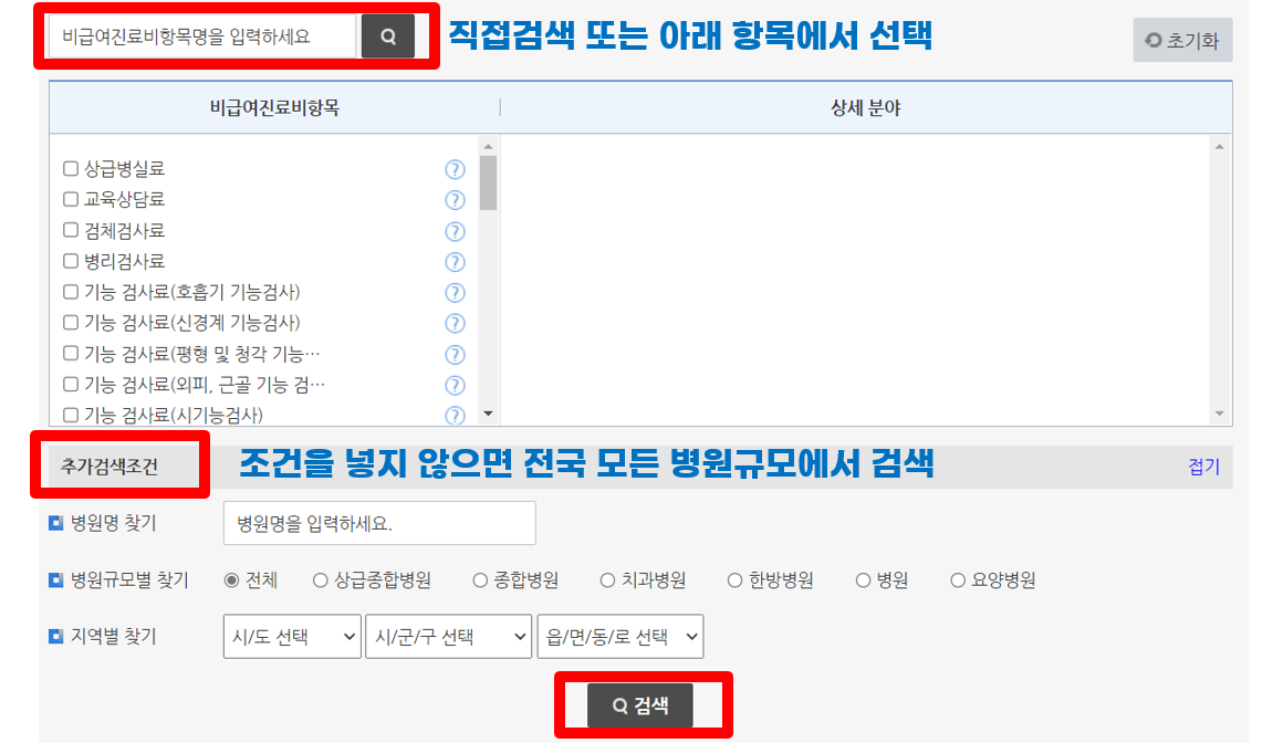 "기관별 현황정보" 에서 진행하는 비급여진료비항목명을 입력하고 병원규모/지역 선택으로 깔끔한 결과를 볼 수 있습니다.
