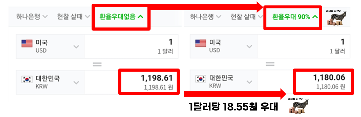 환전 우대부분에서 1달러당 1원 우대와 환율우대 90% 중 어느것이 유리한지 판단하기 어렵다면 네이버 환율 계산기를 활용하면 됩니다. 환율우대가 없을 경우와 환율우대를 적용한 1달러당 비용의 차액을 보면 확실히 판단히기 쉬울 것입니다.