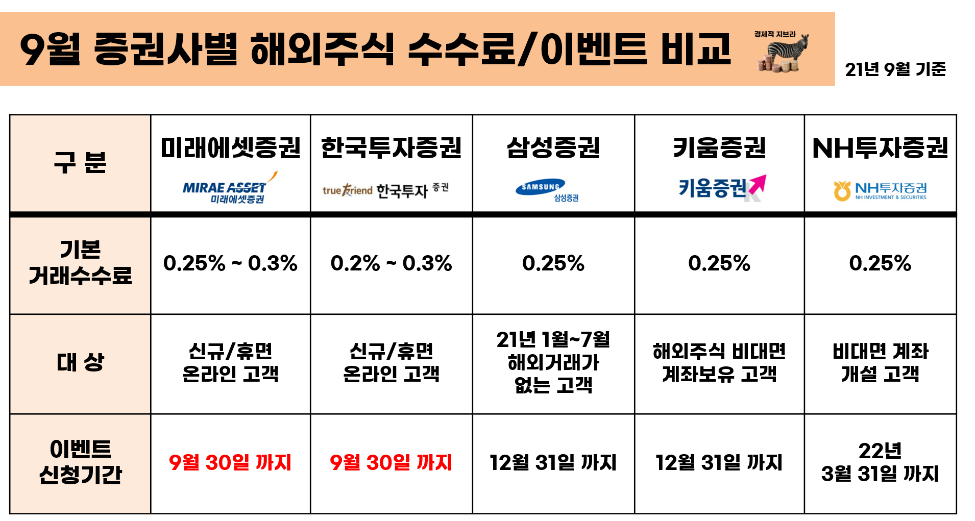 아래 9월 증권사별 해외주식 수수료/이벤트를 비교한 표를 첨부하였으니 내 투자패턴에 유리한 우대를 해주는 증권사를 대상으로 혜택을 누리시기 바랍니다.