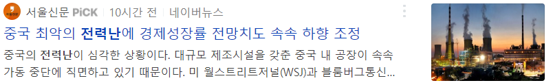 미국 블룸버그 통신은 "중국의 진짜 위기는 헝다 (부채위기를 맞은 부동산 개발기업)가 아니라 전력난' 이라는 발표를 주며 관심을 집중시키고 있습니다.