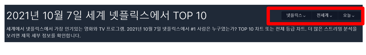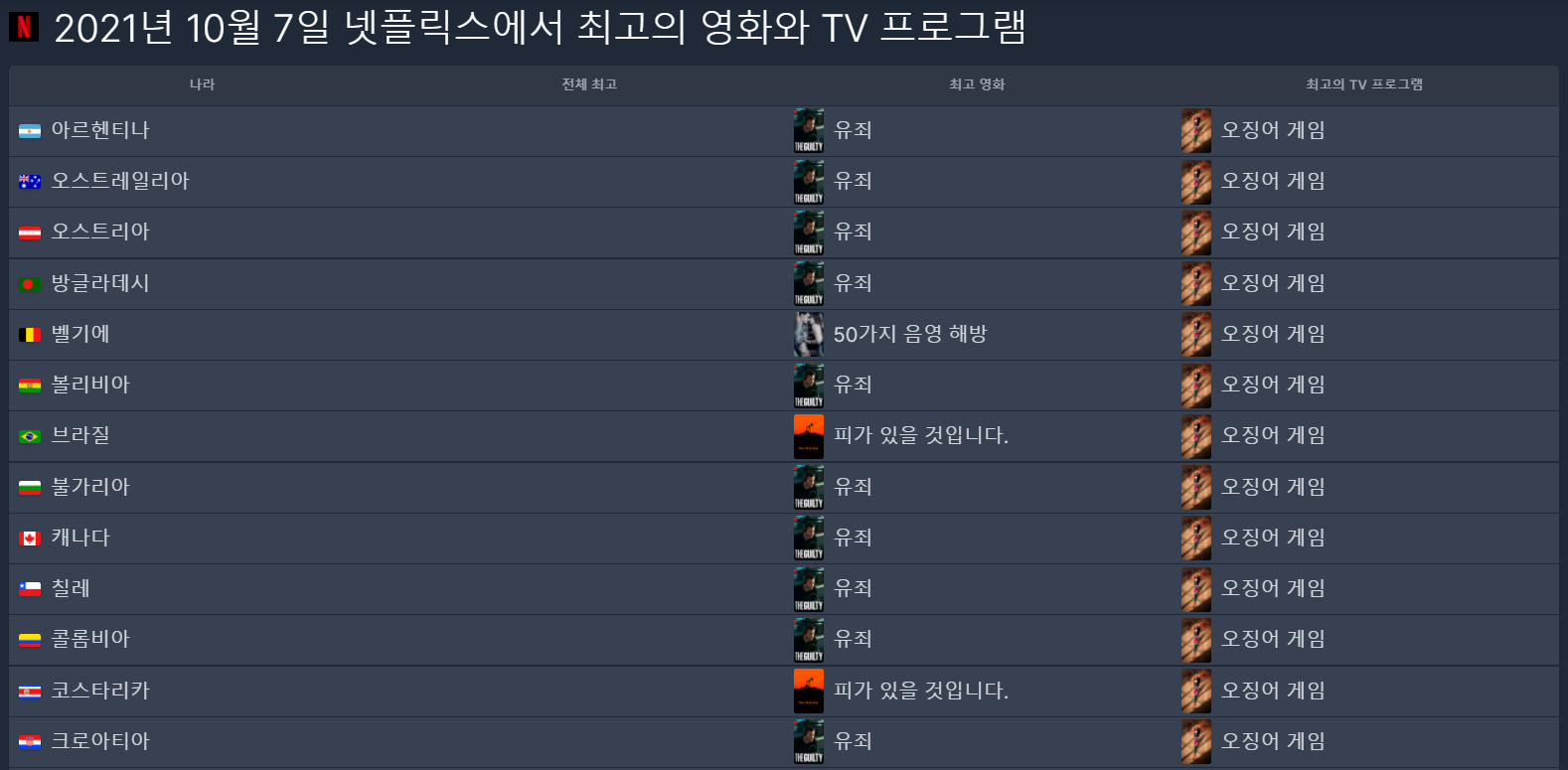 위의 넷플릭스 버튼을 누르면 당일 세계 넷플릭스 영화 부분과 TV프로그램의 TOP 10의 작품을 확인할 수 있습니다. 위 빨간 박스에서 '전세계'를 누르면 국가를 선택할 수 있고, '오늘'을 누르면 다른 기간들을 선택하여 확인할 수 있습니다. 처음 기본적으로 셋팅되어 있는 전세계 데이터를 스크롤을 내려 살펴보면 영화 Top10 순위 리스트와 TV프로그램의 Top10 순위가 순차적으로 나오게 됩니다. 영화부문에서는 '유죄 (Guilty)'가 1위를, TV프로그램에서는 여전히 오징어게임이 1위를 하고 있는 것을 알 수 있습니다.
