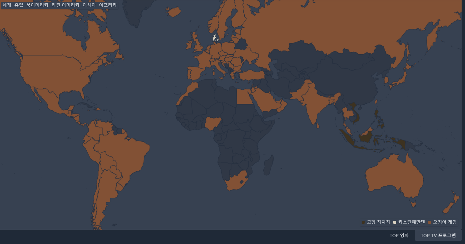 위 검색옵션을 통해서 국가별 순위를 확인할 수는 있지만 하나씩 들어가서 확인해볼 필요까진 없을 것으로 보입니다. 단지 현재 관심있는 컨텐츠가 전체 몇위에 랭크되어 있고 국가별 1위에 있는지 정도만 알면 되는데 해당 내용은 스크롤을 조금 더 내리면 확인 할 수 있습니다. 여전히 소름돋는 오징어게임의 각국의 1위 랭크 모습을 볼 수 있습니다. 지도를 통해서도 대륙별 컨텐츠 인기 트렌드를 확인할 수도 있는데 동남아 일부 국가 (인도네시아, 베트남, 필리핀)에서는 한국드라마인 '갯마을차차차' (Hometown Cha-Cha-Cha)가 1위를 오징어게임을 누르고 1위를 차지하고 있습니다.