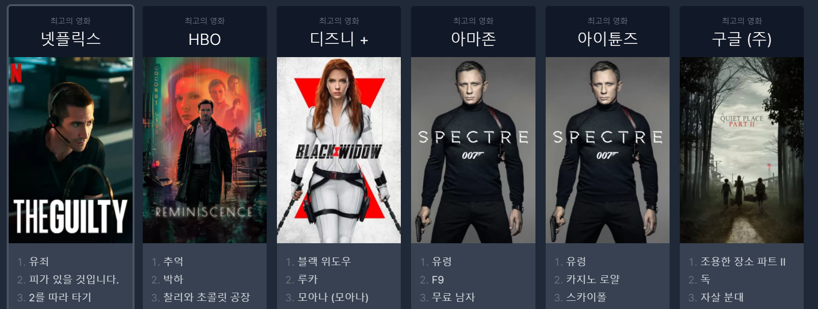 순위 말고도 해당 싸이트에서는 각 작품의 평점이나 공개일정 , 국가별 스트리밍이 가능한 플랫폼 등의 다양한 정보들을 확인할 수 있는데 하나씩 눌러보는 재미가 있어 시간가는 줄 모르고 구경할 수도 있습니다.