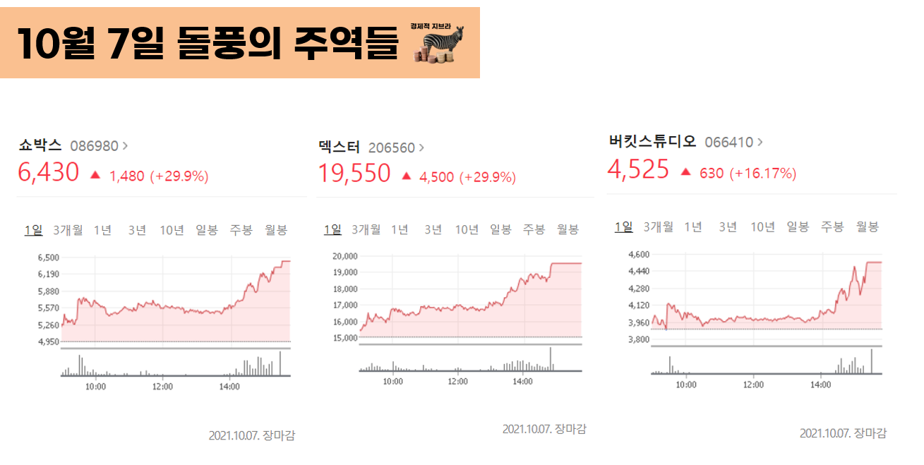해당 블로그에서도 최근 여러번이나 관련된 포스팅을 하였을만큼 최근 연속적인 K-드라마의 흥행 (킹덤, D.P, 오징어게임 등)으로 컨텐츠 관련주, 특히나 OTT (Over The Top : 인터넷을 통하여 미디어 컨텐츠를 제공하는 서비스)와 연관된 종목들이 연일 강세를 보이고 있습니다. 오징어게임의 글로벌 흥행으로 지난주 치솟았다가 조정으로 들어서는 듯한 모습을 보였던 쇼박스(086980), 버킷스튜디오(066410), 덱스터(206560)는 오징어게임 시즌2 제작의 기대감과 미국 유명 토크쇼인 '지미 팰런쇼' 출연 등의 소식으로 금일 엄청난 수급을 보여주며 상한가에 안착하는 등의 모습을 보였습니다.