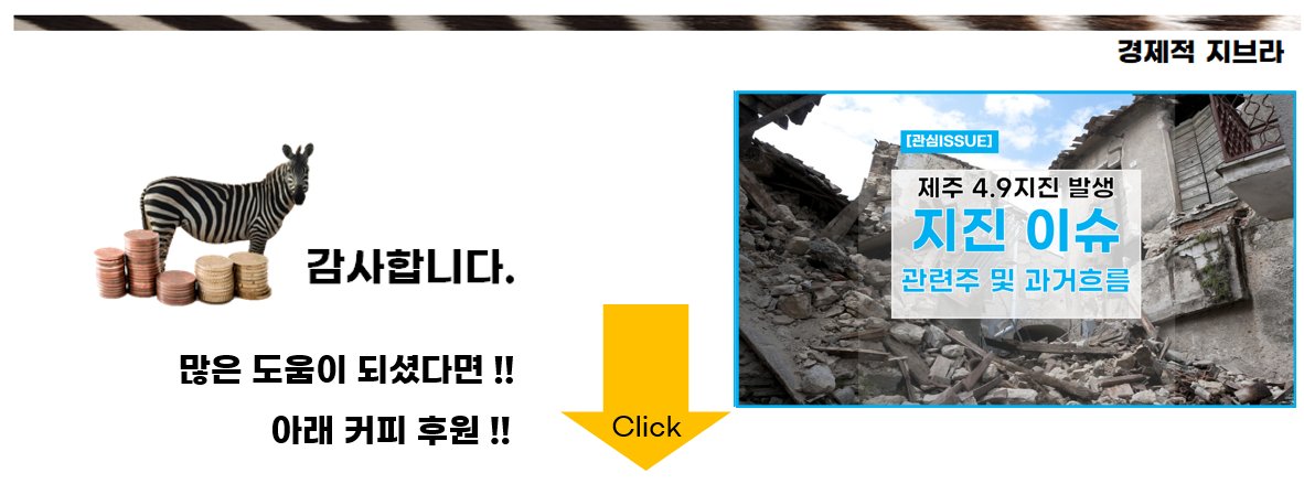 다시 핵심 논점으로 돌아가서 이번 제주 지진 경보는 5.3으로 발표되었지만 추후 4.9로 정정되었는데, 만약 5.3의 지진이었다면 국내 지진 규모의 3위 안에 랭킹될 정도의 강력한 수준이었던 점과 지진이 발생한 시점이 오후 5시 19분으로 장후 시간외 거래가 이루어지고 있던 중이었던 점으로 인하여 지진관련 종목들이 높은 수준의 상승 마감을 하였습니다.