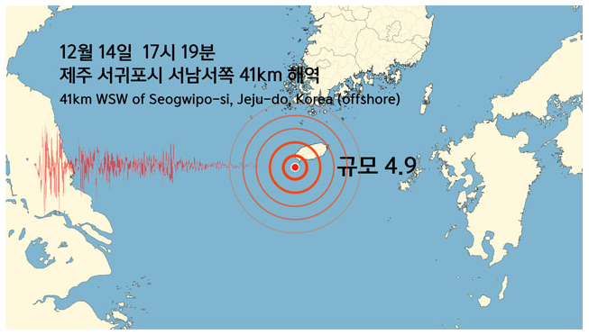 2021년 12월 14일 오후 5시 19분, 제주도 서남쪽 41km 해역에서 4.9 규모의 지진이 발생하였습니다. 오랜만에 발생한 지진이기도 했고, 전국적으로 발송된 긴급재난문자로 인하여 많은 사람들이 놀랄 수 밖에 없었던 사건이었습니다. 과거 하루가 지나고 다시 지진이 발생하거나 여진이 발생하는 등의 이슈도 있었기 때문에 아직은 안심할 단계는 아니라고 하지만 해당 근처 지역에 큰 피해는 없었다는 뉴스가 보도 되며 조금은 안심되는 분위기 입니다.