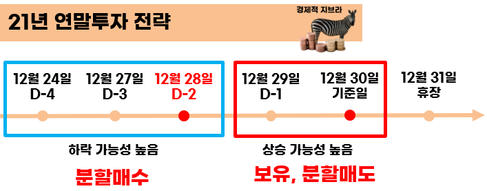 직전 3년 코스피, 코스닥 양 시장 모두 D-1일과 폐장일 (D-day)는 주가가 상승하는 흐름을 보여왔기 때문에 현재 보유하고 있는 현금의 유동성을 70% 이상은 확보한 뒤 D-2 ~ D-4 에서 상대적으로 우량종목임에도 하락분이 눈에 띄는 종목으로 분할 매수 하는 전략으로 접근 하는 것이 효율적으로 보여집니다. (21년 기준으로 12월 24일과 27일)